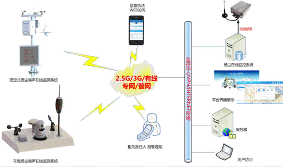 統由前端監測設備、傳輸網絡和中心平臺三部分組成。前端監測設備由車載式或固定式揚塵噪聲監測儀組成。