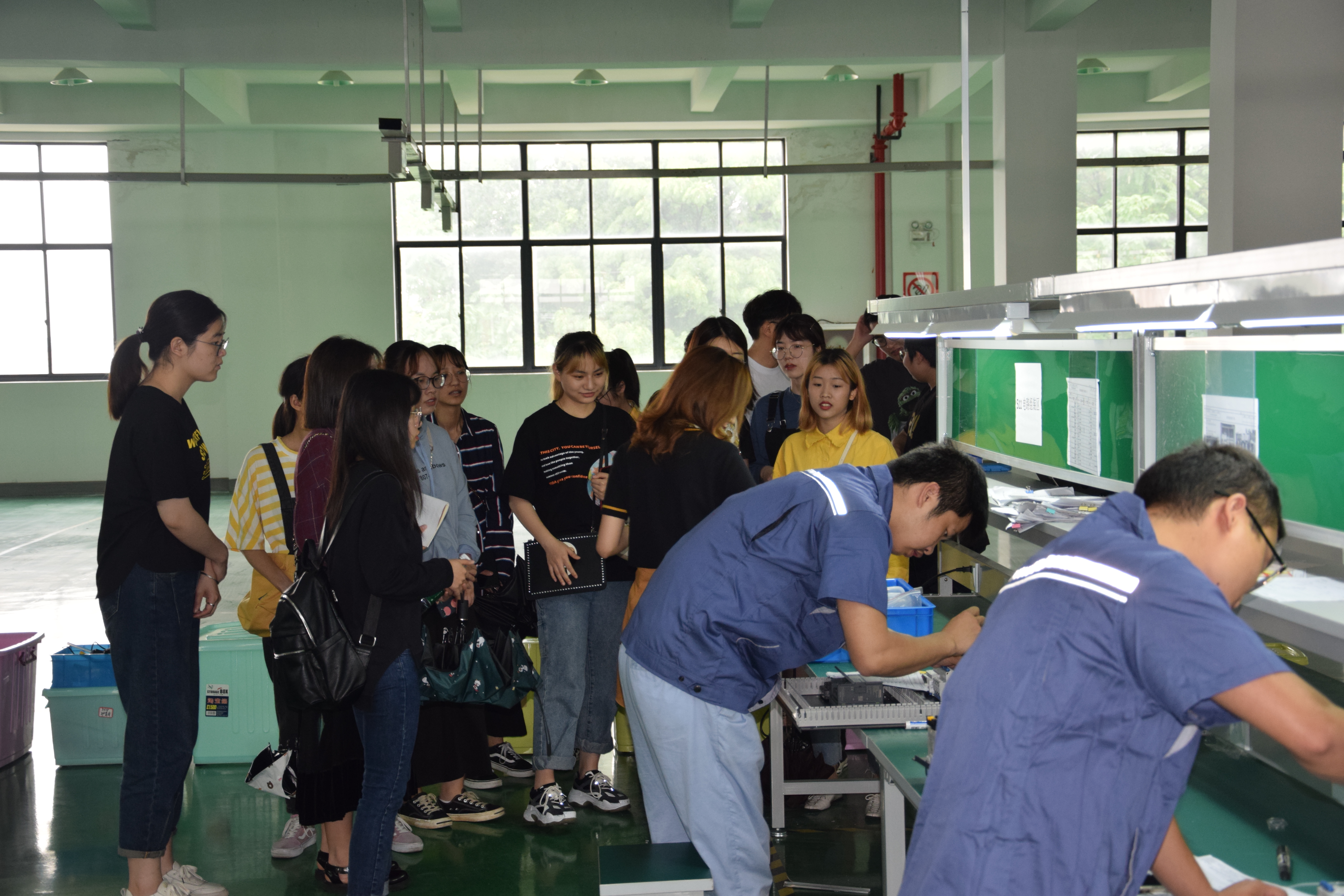 理工大科藝院師生參觀車間生產(chǎn)人員工作。